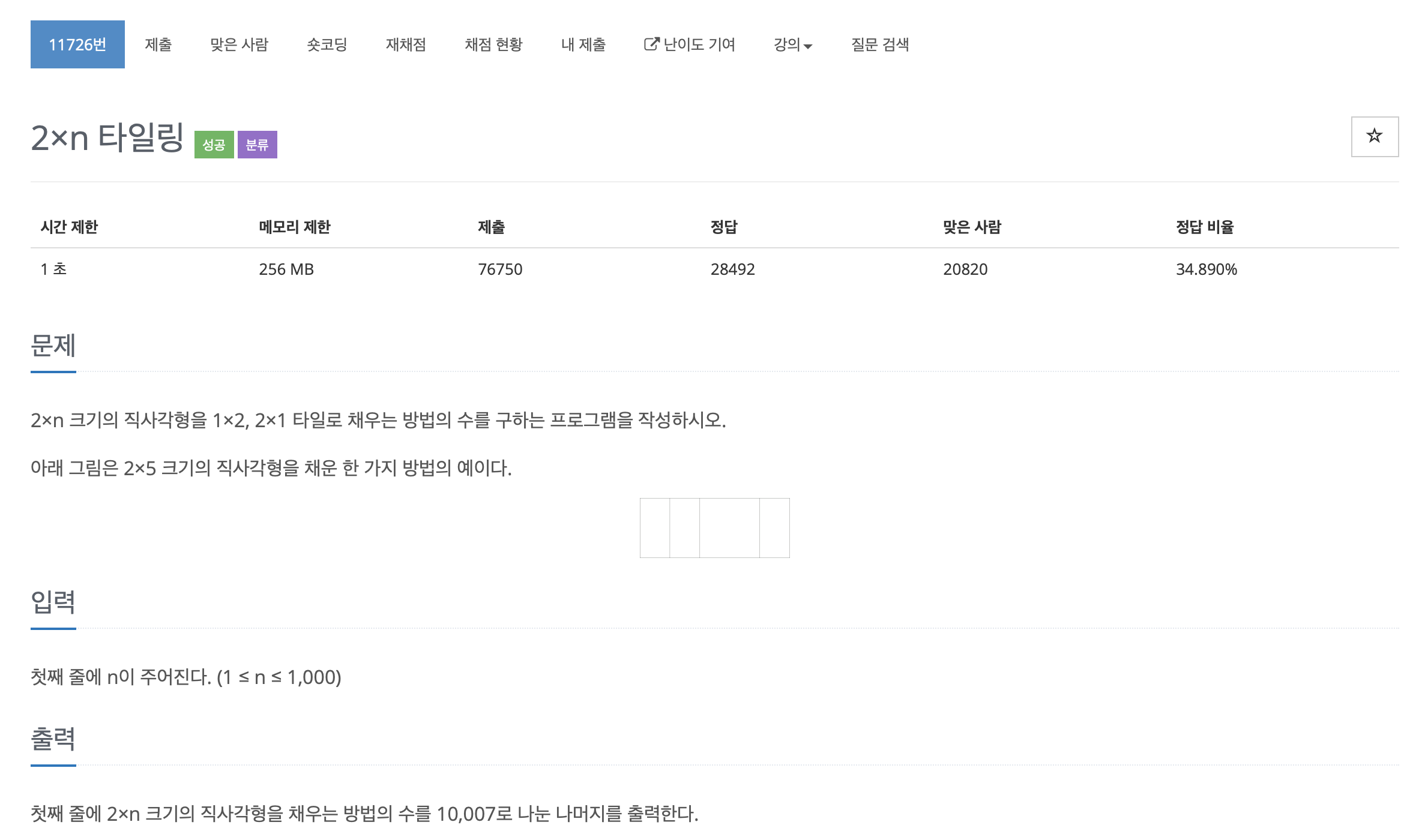 2×n 크기의 직사각형을 1×2, 2×1 타일로 채우는 방법의 수를 구하는 프로그램을 작성하시오. 아래 그림은 2×5 크기의 직사각형을 채운 한 가지 방법의 예이다.