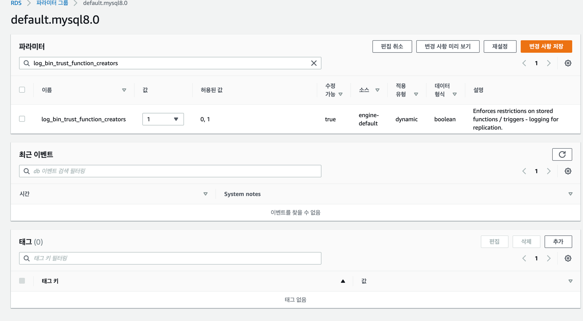→ Cannot modify a default parameter group 이라면서 빨간거 뜨는 경우가 있는데 기본적으로 RDS의 default parameter group은 수정이 안된다. 새로운 그룹을 만들어서 적용하자