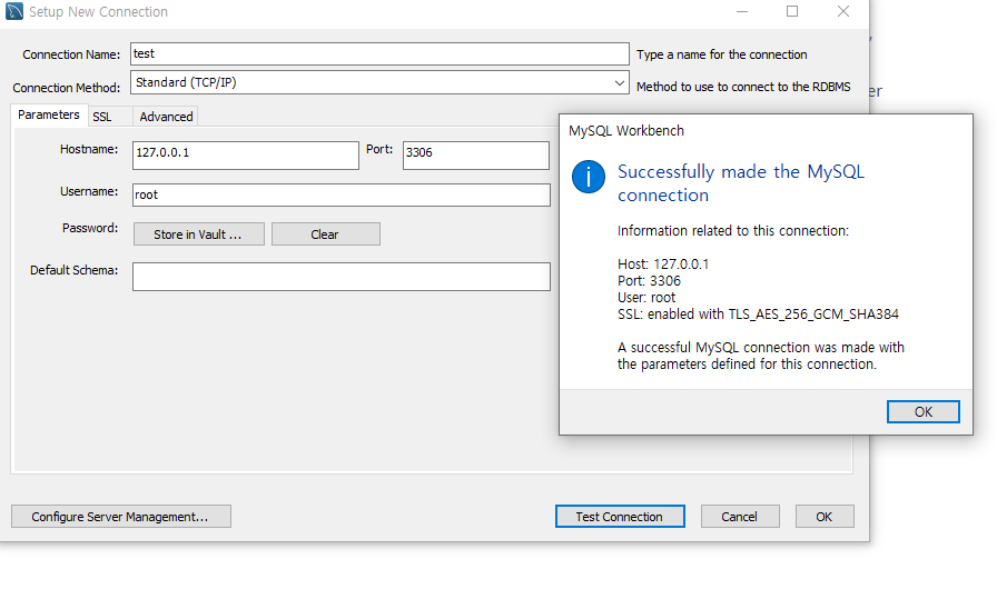 설치하실 때 설정한 root계정의 비밀번호를 Password란의 Store in vault를 눌러 설정해줍니다.