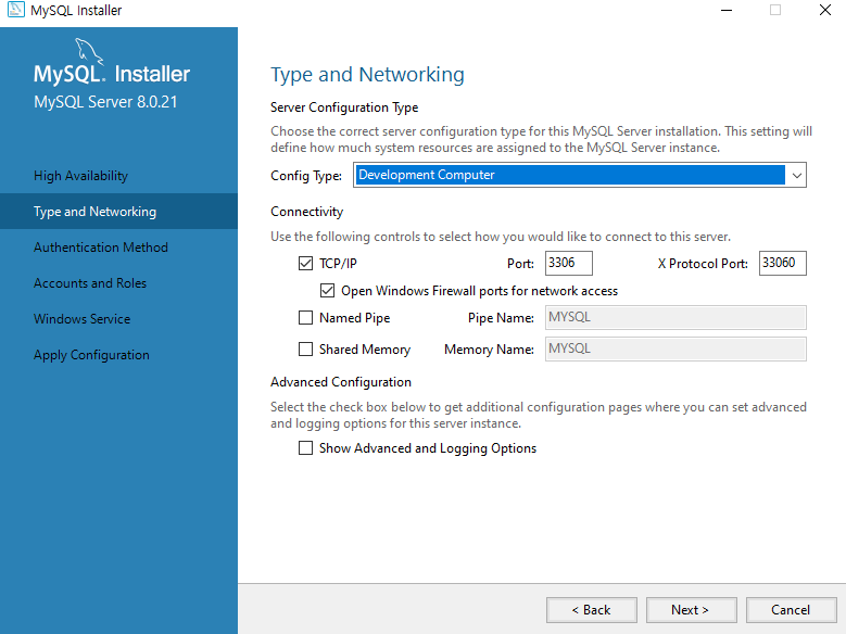 이후 서버설정이 나오는데 저는 개인 컴퓨터이고 테스트용도로 설치하는 것이기 때문에 Development Computer를 했는데 각자 설치하는 목적에 맞게 고르시면 됩니다.