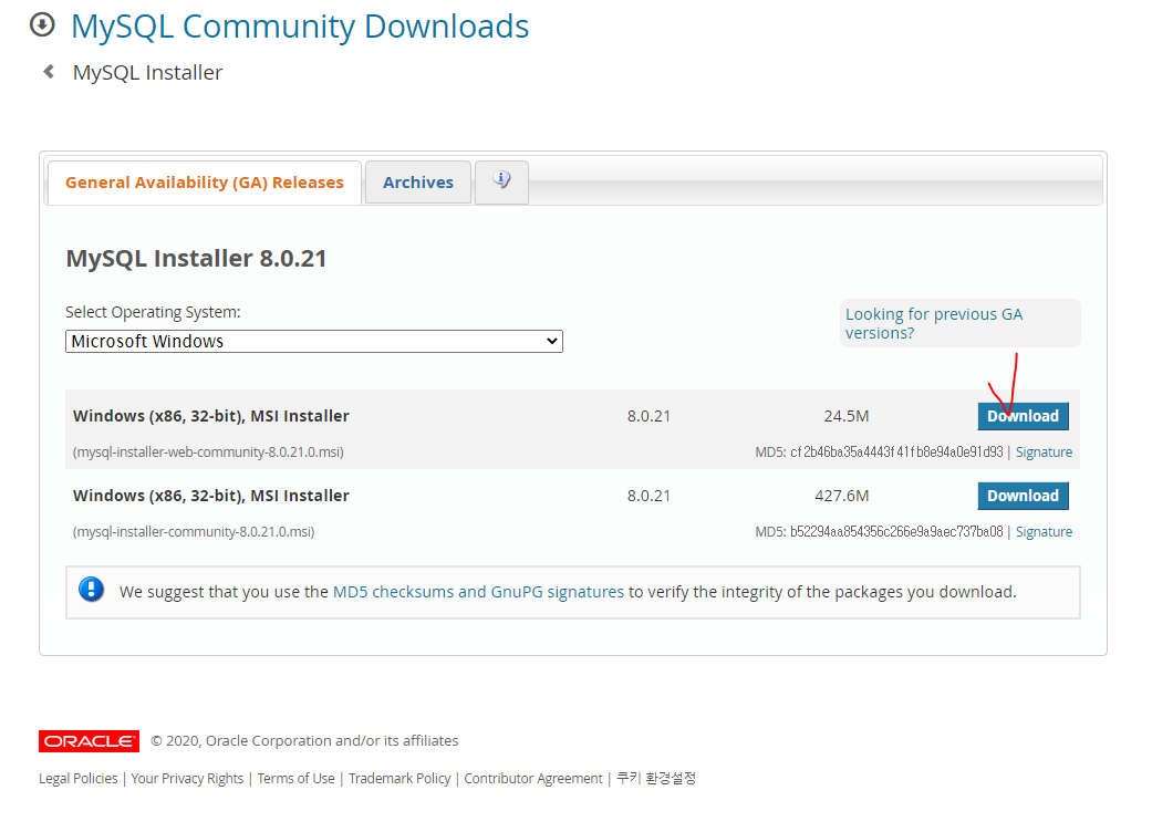 먼저 MySQL페이지로 가서 설치파일을 받으러 갑니다.