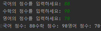 다음은 한 학생의 국어,수학, 영어 과목의 성적을 입력받는 코드이다.