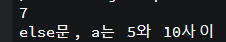 7을 입력시에 5와 10사이이므로 else문이 작동한 것을 볼 수 있다.