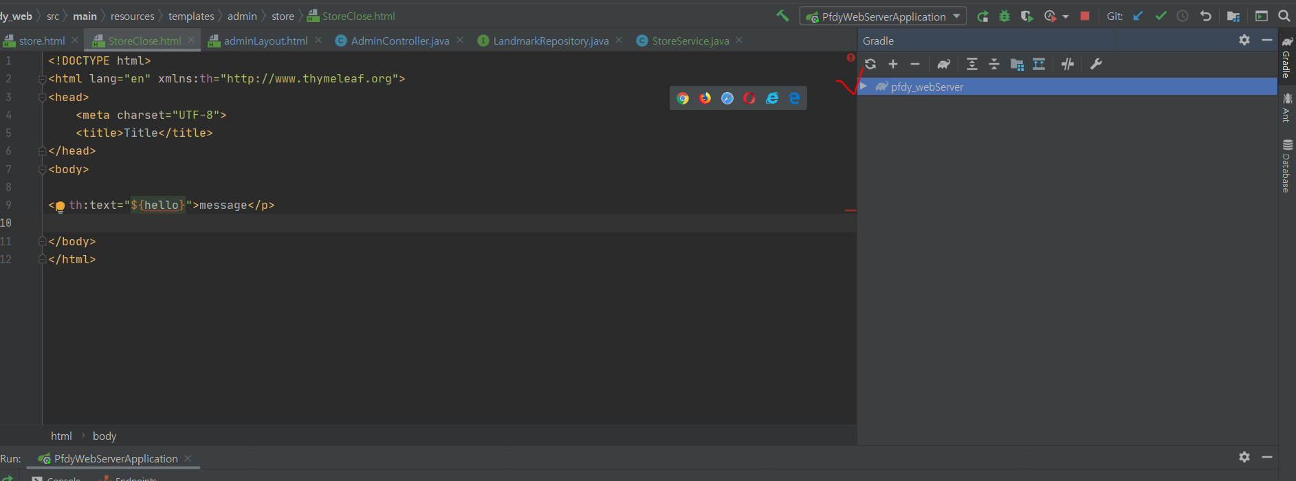 <p th:text="${hello}">message</p> 코드를 삽입해 보았다.