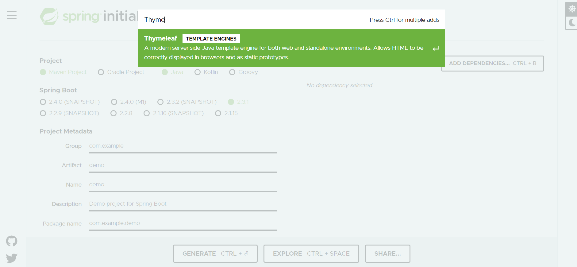 AddDependencies를 선택해 ThymeLeaf를 검색하면 손쉽게 추가할 수 있고