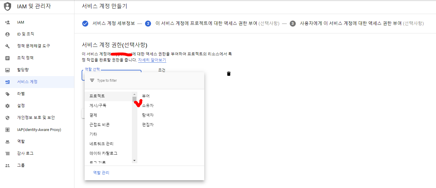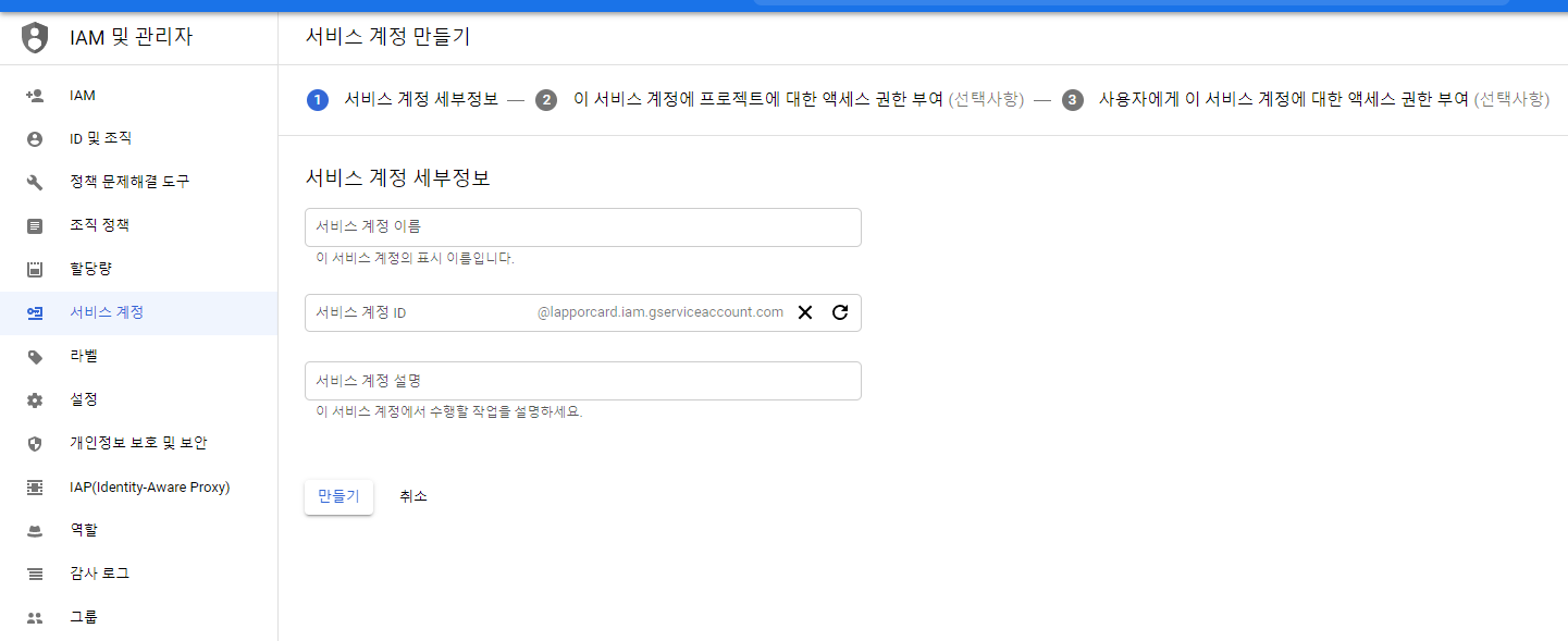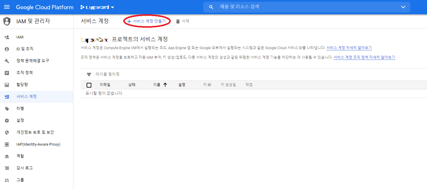 다음으로 해당 프로젝트에서 서비스 계정을 등록해야 한다.