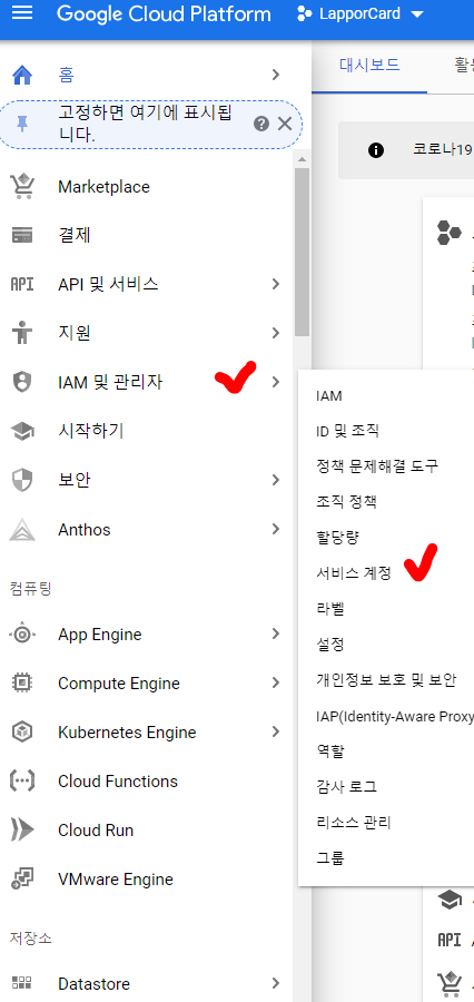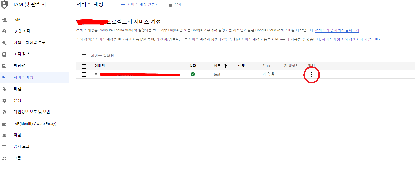 마찬가지로 三모양을 눌러주고 [IAM 및 관리자->서비스 계정]을 눌러준다.