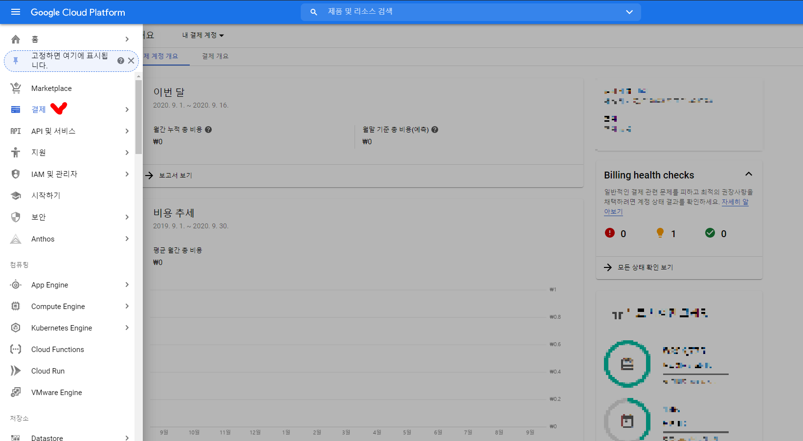 구글의 Vision API를 사용하기 위해서는 먼저 결제를 등록해야 한다.