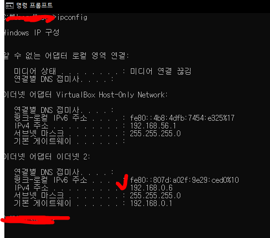 ipconfig로 찾은 ip값이 내 컴퓨터의 내부 ip와 일치하는지 확인해보자.