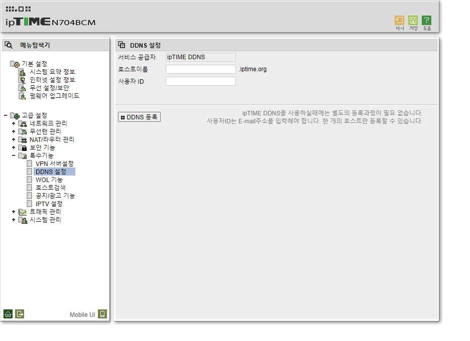 고급설정- 특수기능- DDNS설정 을 들어간다.