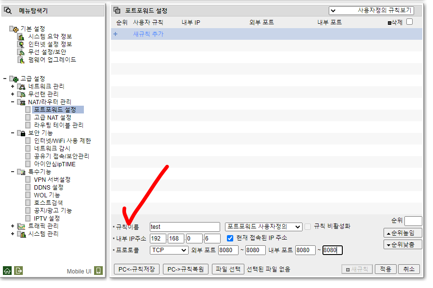고급설정- NAT/라우터 관리- 포트포워드 설정에 들어간다.