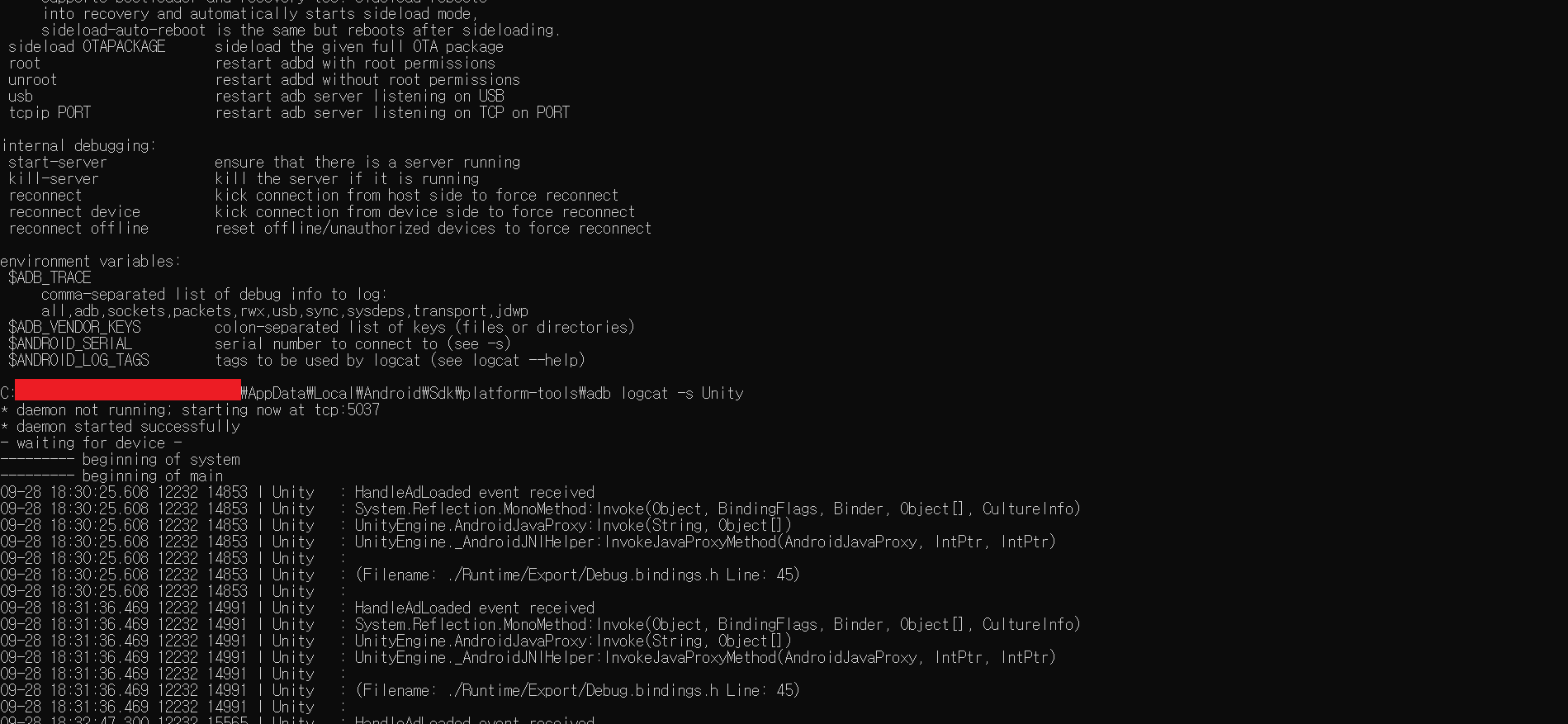 C:\.....생략......\AppData\Local\Android\Sdk\platform-tools\adb logcat -s Unity