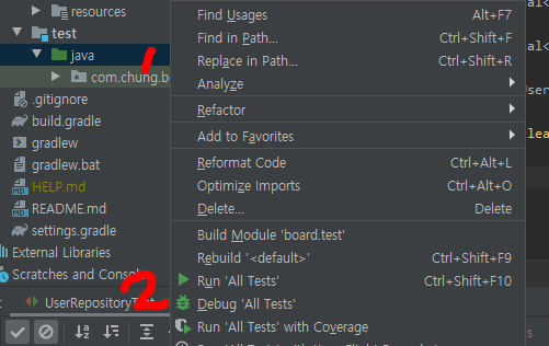 인텔리제이를 사용하고 있다면 테스트할 코드 클래스 명(UserRepository)에 커서를 놓고